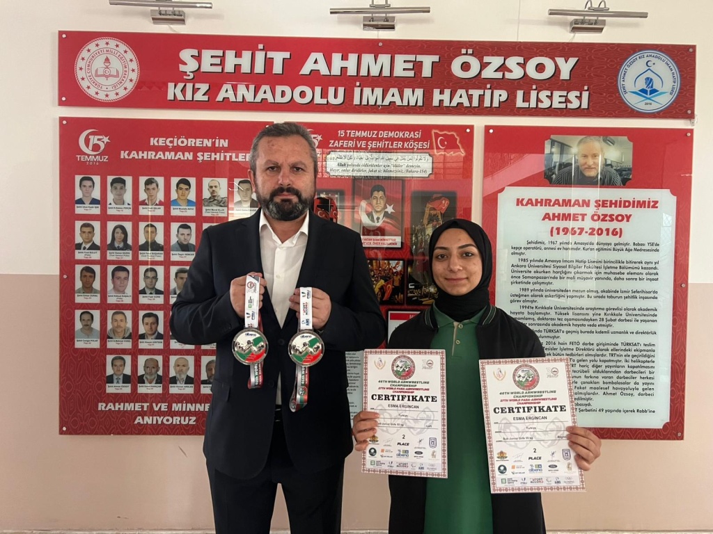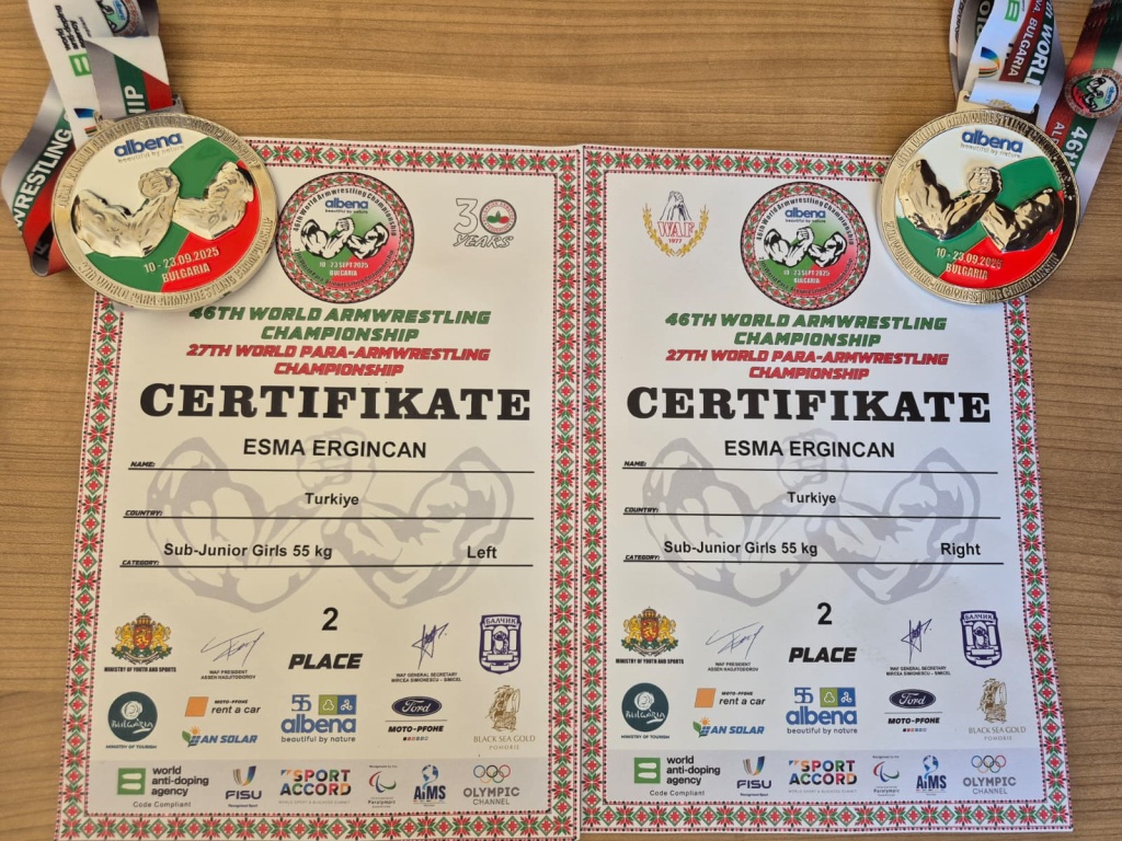 Bulgaristan’ın Albena Şehrinde 10-23 Eylül 2025 tarihleri arasında bu sene 46.sı düzenlenen Dünya Bilek Güreşi Şampiyonası 15 yaş altı 55 kg kategorisinde yarışan Milli Sporcu Öğrencimiz Esma Ergincan hem sol kol hem de sağ kolda Dünya İkincisi olarak büyük bir başarıya imza attı.